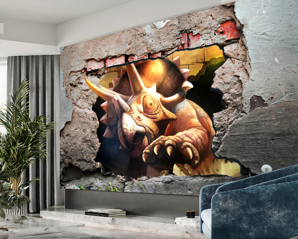 Tapet Fototapet dinozaur distruge un zid de piatră (articol pb8926 ) din categoria Fototapet 3D